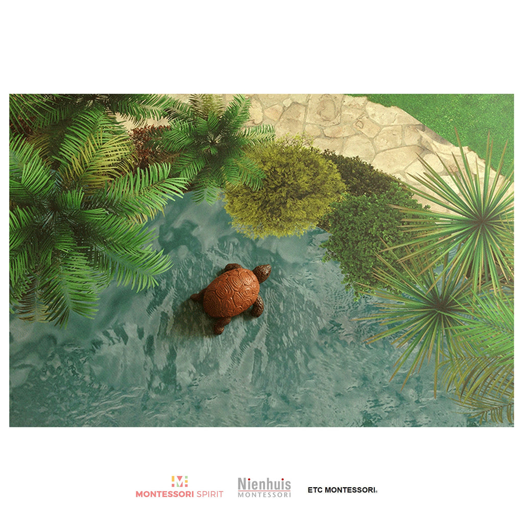 Everything you will need is included. Life cycle figures are detailed and accurate, sorting cards, nomenclature, rebus books, and a beautiful and highly detailed mat that measures 36" x 36" that is constructed from durable vinyl and doesn't require lamination. Each element on the mat has been carefully constructed, designed, and then pictured making you think you are actually looking at real water, grass and trees.