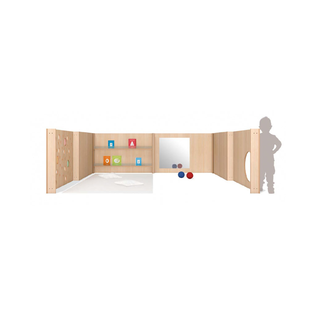 Un système innovant pour la construction d’espaces appropriés pour les enfants et pour les différentes activités. Différents panneaux sont réunis pour former des murs d’équipements multifonctionnels, enrichis avec des miroirs et des étagères.