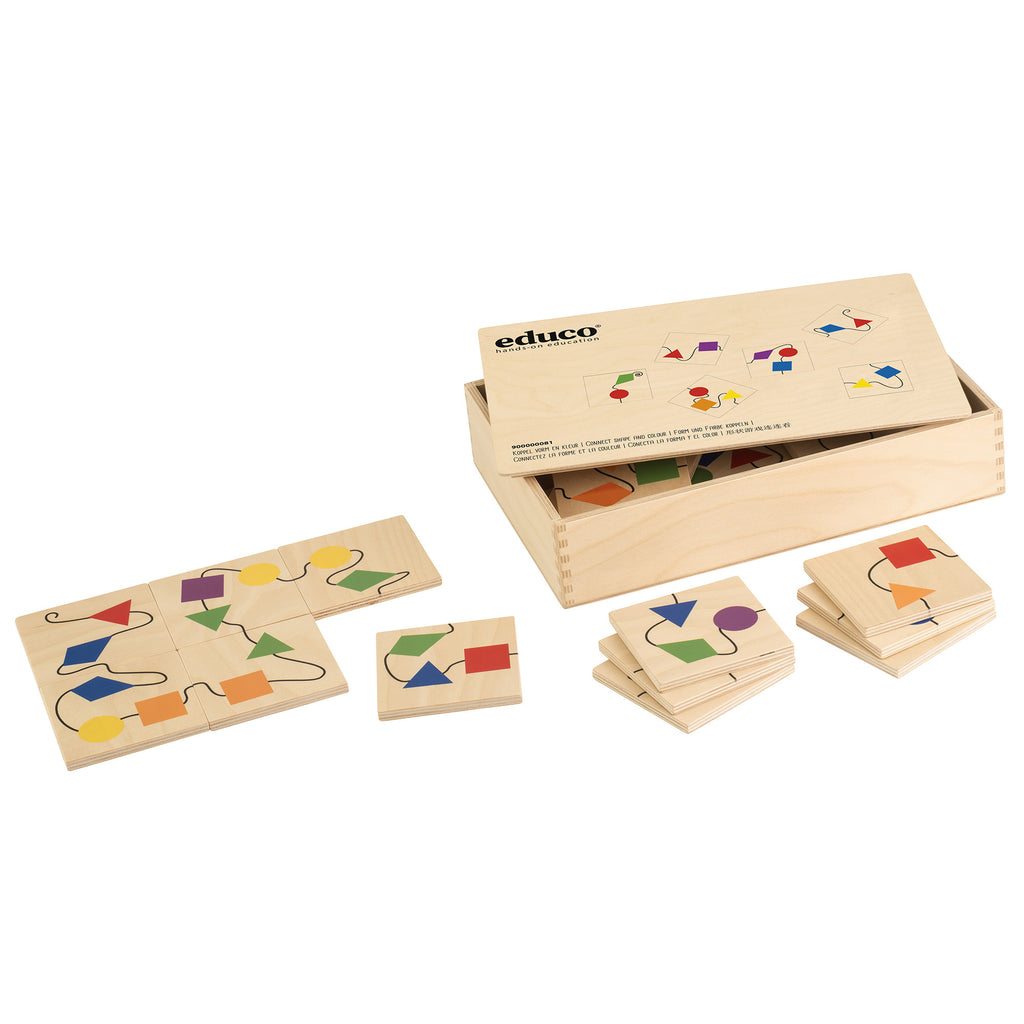Jeu d'association qui combine formes et couleurs. Les enfants placent des dominos et relient les formes ou les couleurs pour créer une chaîne continue.